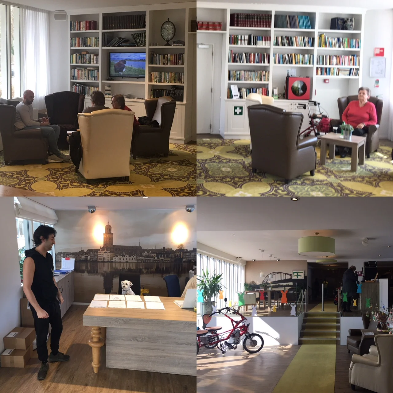 Top left: Patrick, a student, talking with several of the elderly residents. Top right, when you walk in the seating area and bookcase to the right. Bottom Left: Sores saying hello to Benji (the dog) at the front test. Bottom right, coffee machine and seating area when you first walk in.